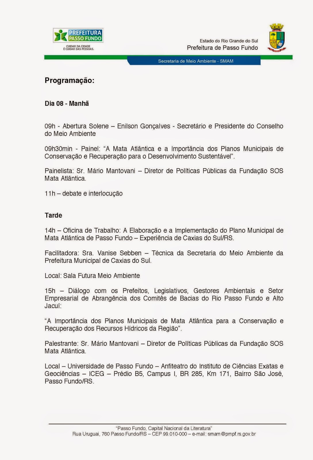 O evento inicia às 9h e segue durante todo o dia.Os Comitês de Gerenciamento das Bacias Hidrográficas do Rio Passo Fundo (CBHPF) e doAlto Jacuí (COAJU) ressaltam a importância da participação dos Prefeitos, Vereadores, GestoresAmbientais, Entidades membros dos Comitês e Setor Empresarial no DEBATE que aconteceráàs 15h, na Universidade de Passo Fundo (UPF), conforme