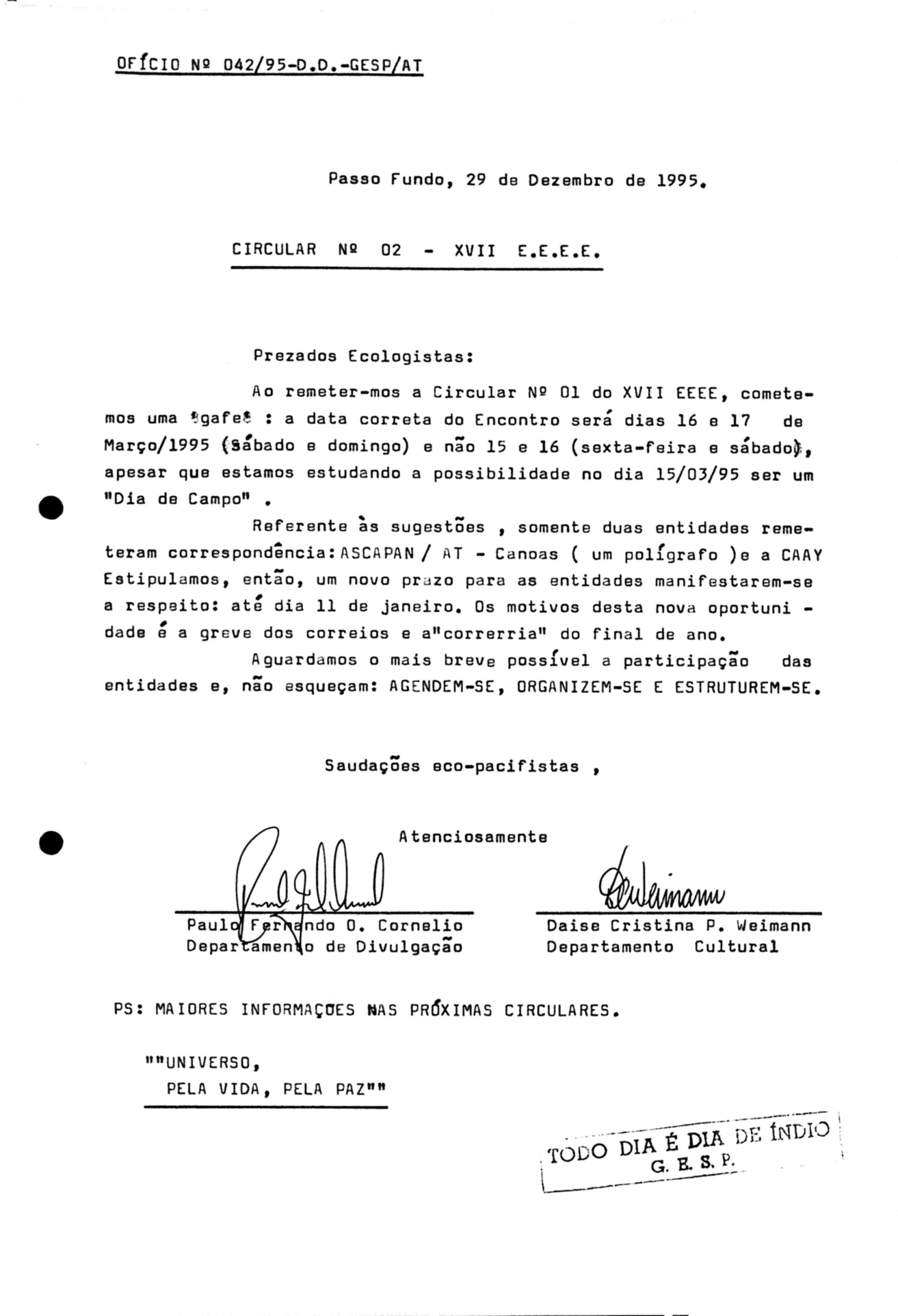 Ofício circular Voltar 18 de fevereiro de 2026 by administrador@sentineladospampas.eco.br   Documento 59 Baixar Metadados Miniatura Compartilhe Nº Registro59TítuloOfício circularDescriçãoOfício circular, divulgação nova data do XVII Encontro Estadual de Entidade Ecológicas XVII EEEEData1995-12-29Tipo de documentoDatilografadoColeçãoDocumental Continuar navegando Ofício expedido Ofício expedido Voltar para a lista de itens