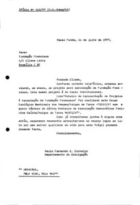 Ofício expedido Voltar 18 de fevereiro de 2026 by administrador@sentineladospampas.eco.br   Documento 36 Baixar Metadados Miniatura Compartilhe Nº Registro36TítuloOfício expedidoDescriçãoOfício expedido para Fundação Francisco sobre envio de projeto de Apoio InstitucionalData1997-07-11Tipo de documentoDatilografadoColeçãoDocumental Continuar navegando Ofício expedido Ofício expedido Voltar para a lista de itens