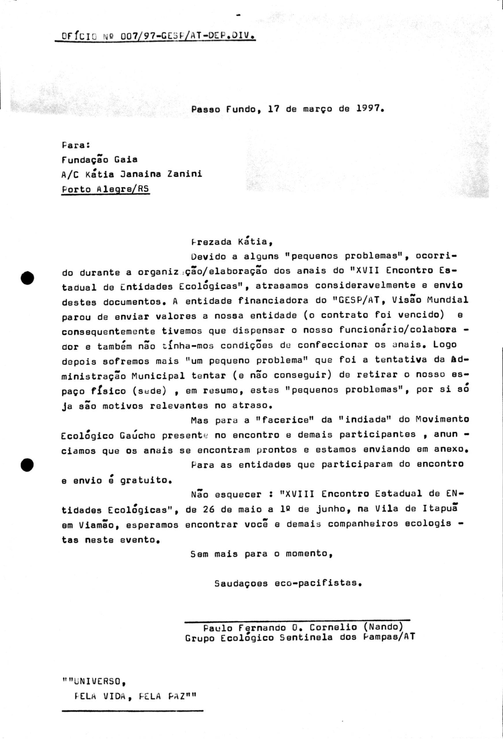 Ofício expedido Voltar 18 de fevereiro de 2026 by administrador@sentineladospampas.eco.br   Documento 39 Baixar Metadados Miniatura Compartilhe Nº Registro39TítuloOfício expedidoDescriçãoOfício expedido para Fundação Gaia/Porto Alagre/RS, sobre os Anais do XVIII Encontro Estadual de Entidades Ecológicas (XVIII EEEE)Data1997-03-17Tipo de documentoDatilografadoColeçãoDocumental Continuar navegando Ofício expedido Ofício expedido Voltar para a lista de itens