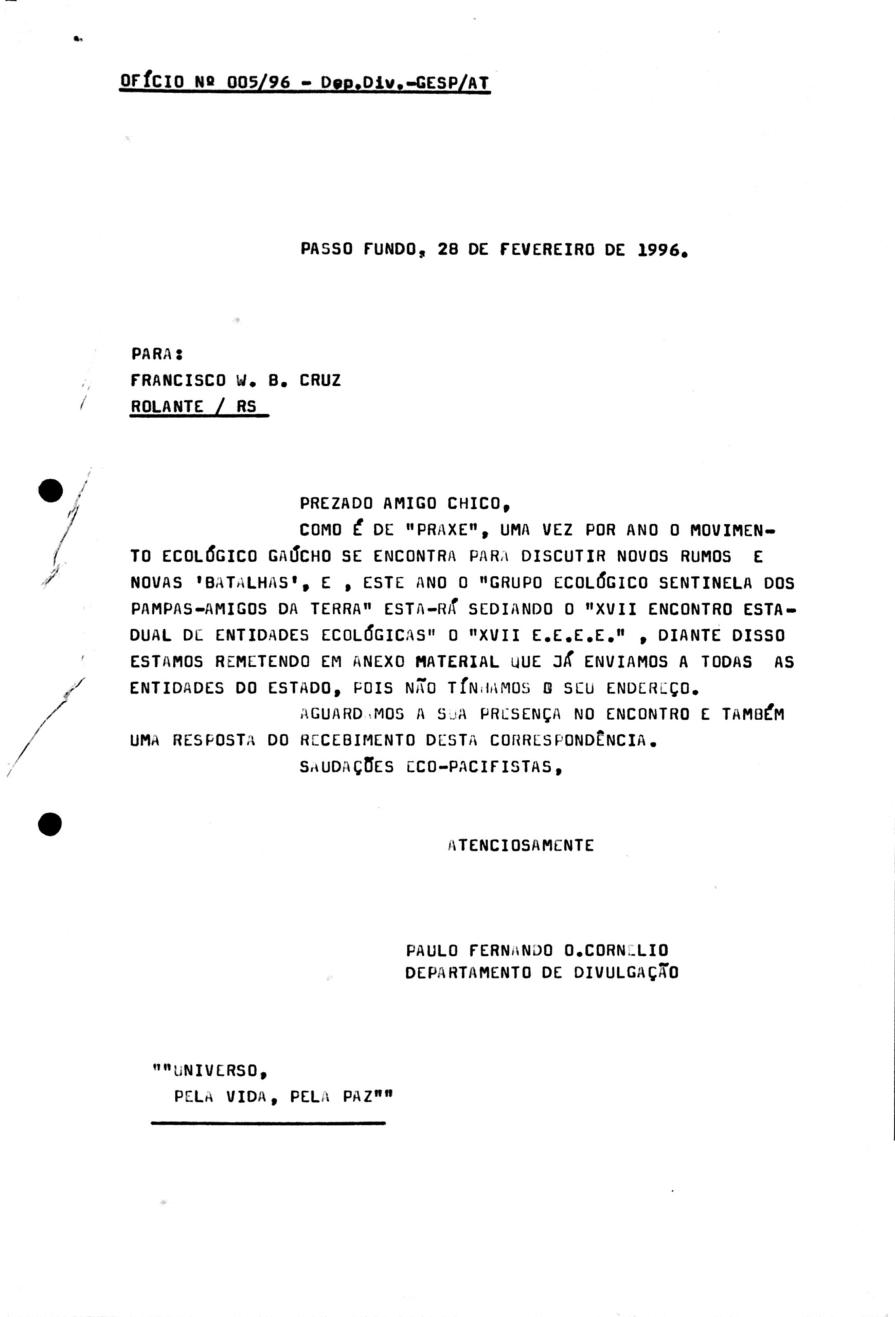 Ofício expedido Voltar 18 de fevereiro de 2026 by administrador@sentineladospampas.eco.br   Documento 58 Baixar Metadados Miniatura Compartilhe Nº Registro58TítuloOfício expedidoDescriçãoOfício expedido para Francisco Cruz, divulgação XVII Encontro Estadual de Entidade Ecológicas XVII EEEEData1996-02-28Tipo de documentoDatilografadoColeçãoDocumental Continuar navegando Ofício expedido Ofício circular Voltar para a lista de itens