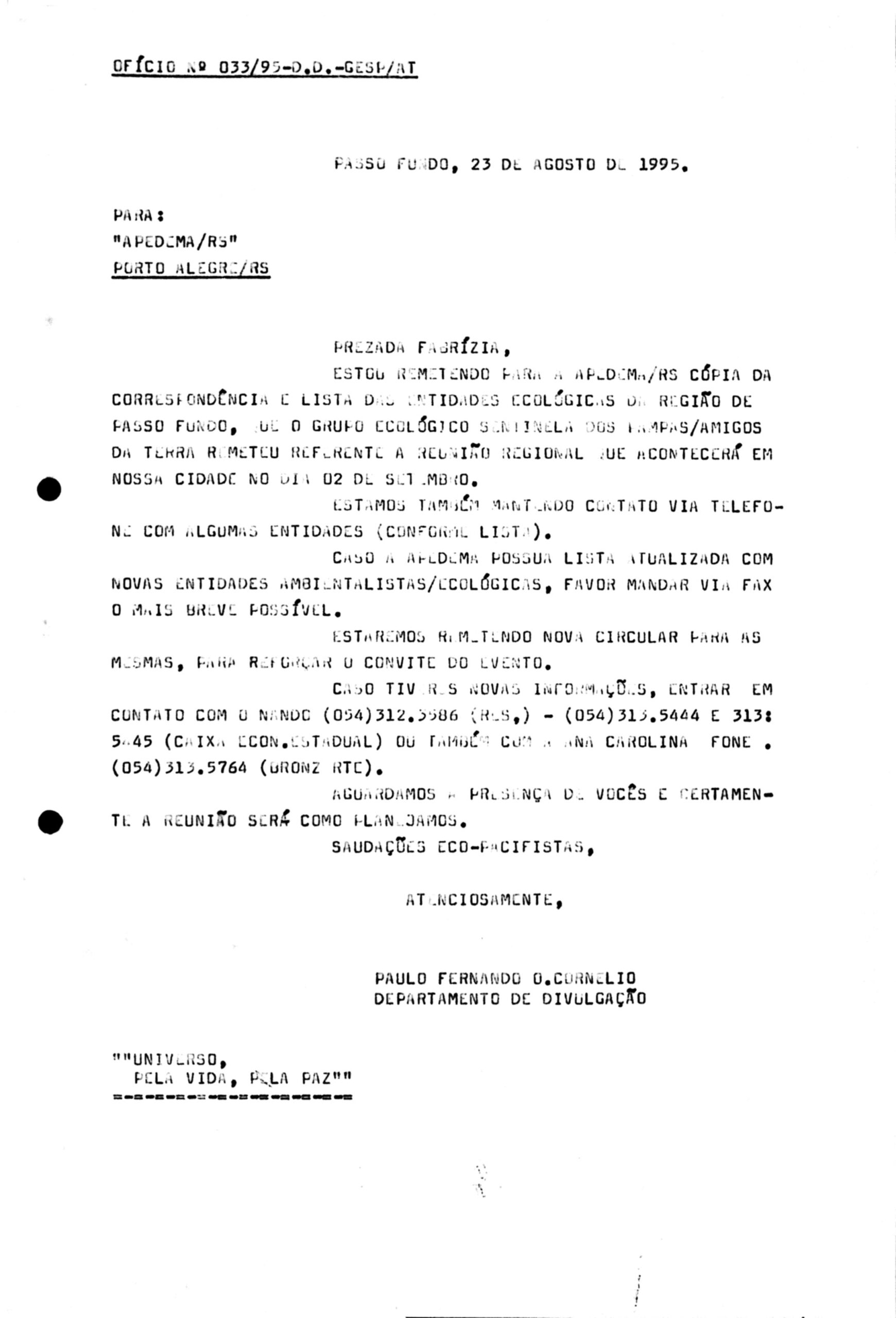 Ofício expedido para Apedema, da lista de Entiadades Ecológicas da Região de Passo Fundo