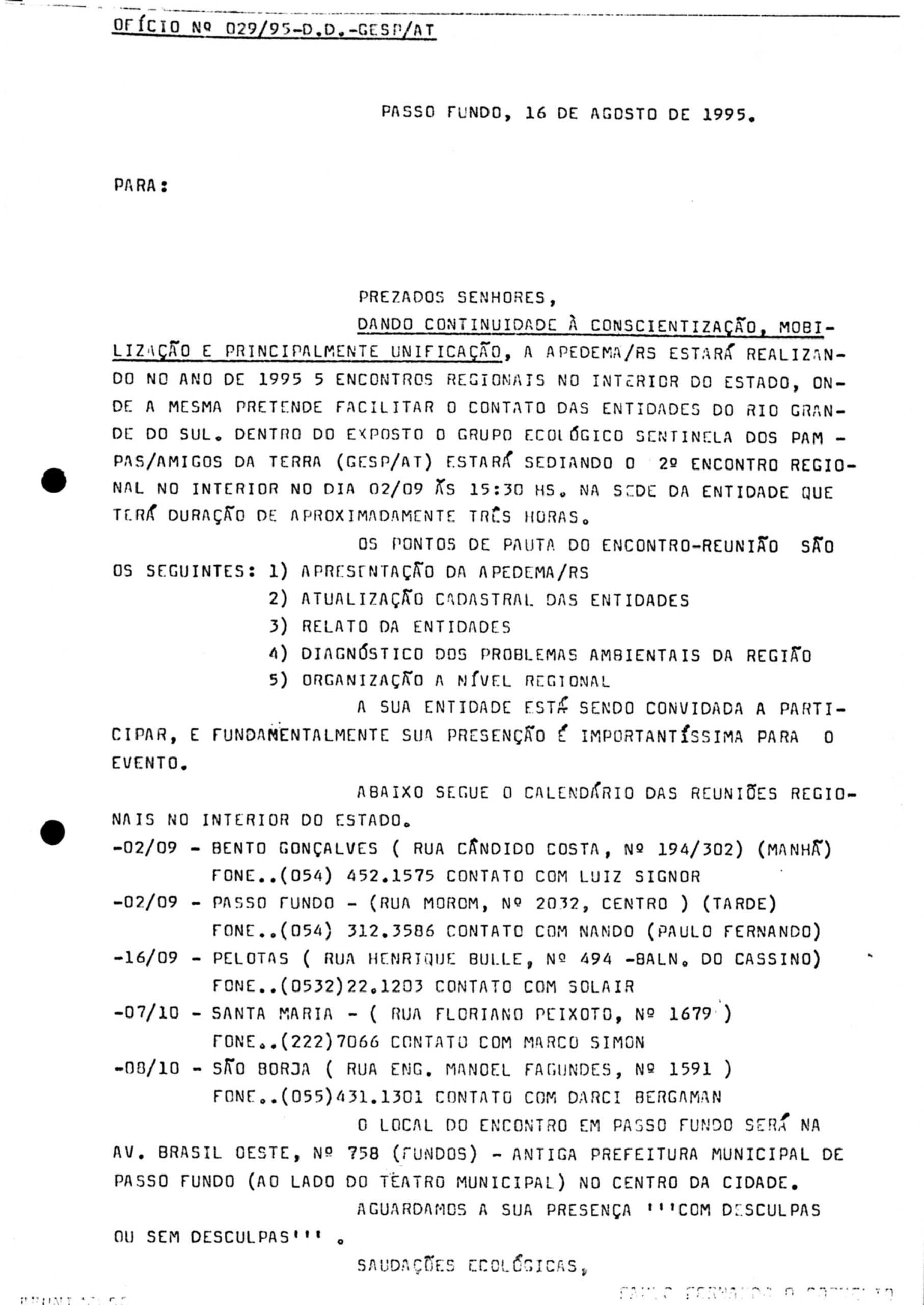 Ofício expedido Voltar 18 de fevereiro de 2026 by administrador@sentineladospampas.eco.br   Documento 68 Baixar Metadados Miniatura Compartilhe Nº Registro68TítuloOfício expedidoDescriçãoOfício expedido para divulgação das Reuniões Regionais e convite para a reunião de Passo Fundo para mobilização das entidade ecológicas do RSData1995-08-16Tipo de documentoDatilografadoColeçãoDocumental Continuar navegando Ofício expedido Ofício expedido Voltar para a lista de itens