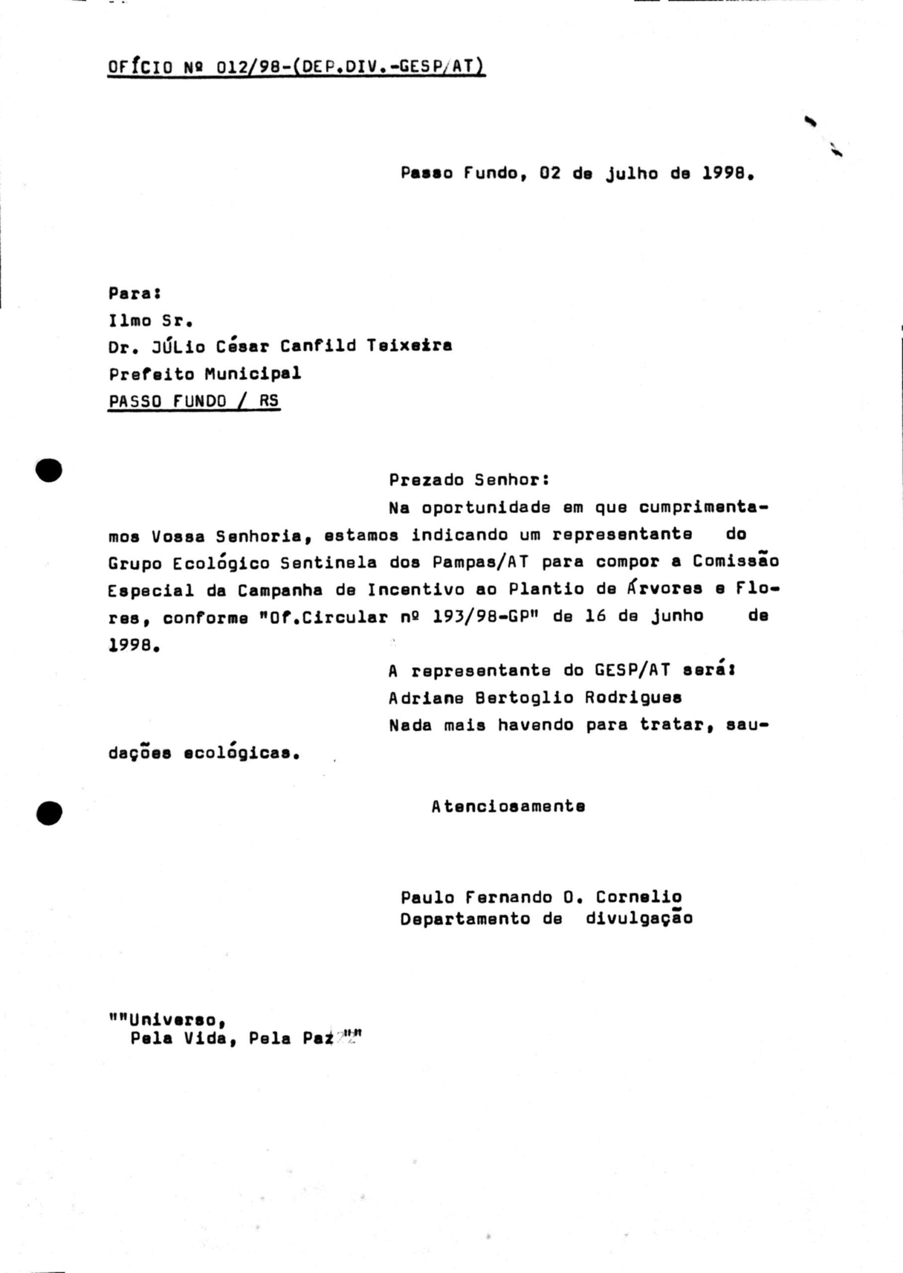 Ofício expedido Voltar 18 de fevereiro de 2026 by administrador@sentineladospampas.eco.br   Documento 20 Baixar Metadados Miniatura Compartilhe Nº Registro20TítuloOfício expedidoDescriçãoOfício expedido para Prefeito Municipal, Comissão Especial da Campanha de Incentivo ao Plantio de Árvores e FloresData1998-07-02Tipo de documentoDatilografadoColeçãoDocumental Continuar navegando Ofício expedido Ofício expedido Voltar para a lista de itens