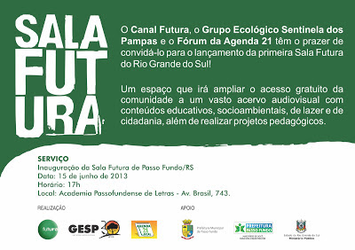 A comunidade passofundense pode se preparar, dia 15 de junho será inaugurada a Sala Futura Meio Ambiente. Os parceiros sintam-se apoiados por mais um instrumento de fortalecimento da luta ambiental no Rio Grande do Sul.