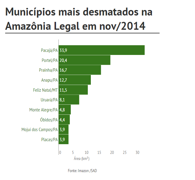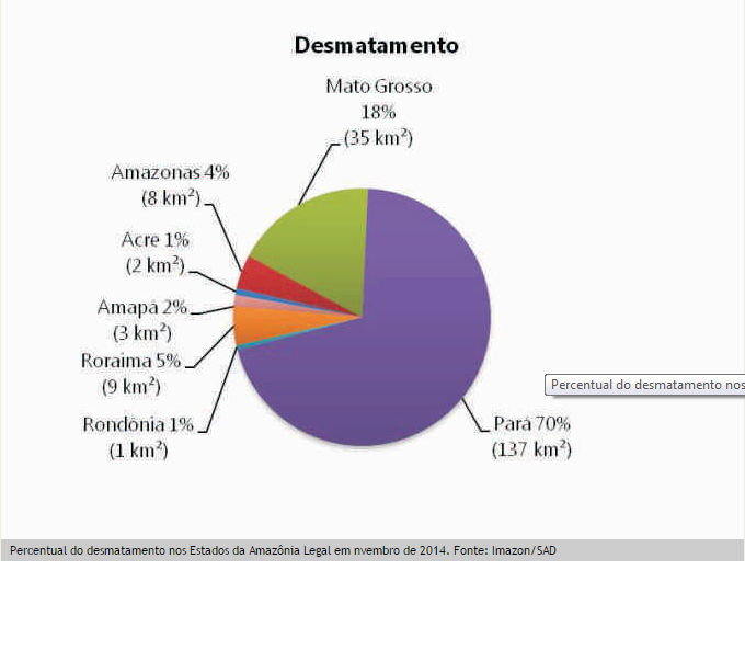 O ano fecha com mais um dado preocupante sobre o desmatamento na Amazônia Legal no segundo semestre de 2014. Segundo a ONG Imazon, em novembro houve uma perda de 195 km² de florestas, o que equivale a um aumento de 427% sobre novembro de 2013. O número se refere ao chamado corte raso – desmatamento total. O Imazon também monitora a área de floresta degradada. Nesse caso, houve 86 km2 de degradação neste novembro contra 9 km2 em novembro passado.
