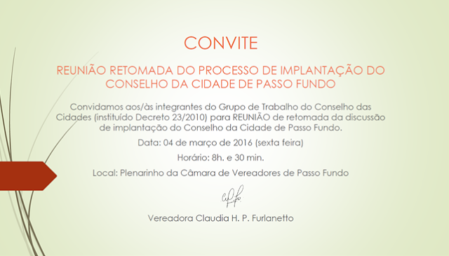 Então, a Vereadora Claudia Furlanetto está propondo uma Reunião inicial com os integrantes do GT Conselho da Cidade instituído pelo decreto n° 23/2010.