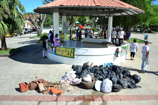 crianças da comunidade. Ao lado do coreto foi exposto todo o lixo coletado na