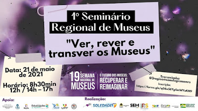 A 3ª Região Museológica do Sistema Estadual de Museus/RS e o Museu das Pedras Preciosas e Mineralogia Egisto Dal Santo, de Soledade, está realizando do 1º Seminário Regional de Museus “Ver, rever e transver os museus” , que se acontecerá de forma online, no dia 21 de maio de 2021, das 8h30min às 12h e das 14h às 17h, durante a Semana Nacional dos Museus, promovida pelo Instituto Brasileiro de Museus (IBRAM).