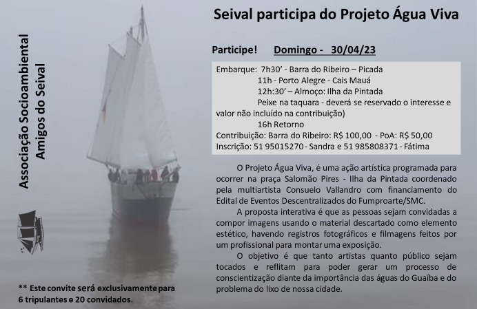 Porto Alegre receberá no domingo, dia 30 de abril, um belo programa para quem gosta de arte e simpatiza com as questões ambientais. Trata-se do Projeto Água Viva, uma ação artística programada para ocorrer às 14.30 na praça Salomão Pires, na Ilha da Pintada. Para quem quiser sair do asfalto e ainda realizar um programa completo de imersão à história gaúcha e à vida ribeirinha de nossa cidade, será possível realizar a experiência da travessia do Guaíba com o lanchão Seival, saindo de Barra do Ribeiro e posteriormente do Cais Mauá em Porto Alegre, e todos ainda poderão desfrutar do tradicional almoço com peixe na taquara da região e visitar a feira de artesanato local.