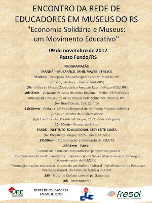 by FLÁVIA Leia Mais...Com o tema “Economia Solidária e Museus: um Movimento Educativo” a Rede de Educadores em Museus (REM/RS) realizará o último encontro do ano em Passo Fundo durante...