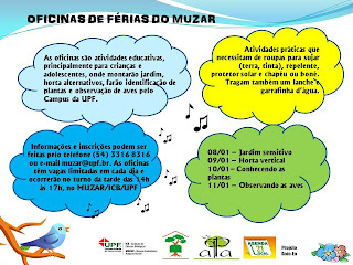 by FLÁVIA Leia Mais...04/01/2013 – 17:00 Muzar realiza oficinas de férias O Museu Zoobotânico Augusto Ruschi (Muzar), vinculado ao Instituto de Ciências Biológicas da Universidade de Passo Fundo (ICB/UPF), está com...