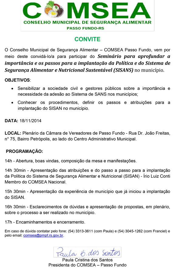 by GESP Leia Mais...O Conselho Municipal de Segurança Alimentar – COMSEA Passo Fundo, vem por meio deste convidar V.S.ª para participar do SEMINÁRIO que terá como foco a importância e...