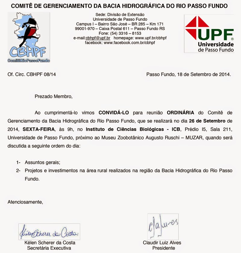Ao cumprimentá-lo (a) vimos CONVIDÁ-LO (A) para reunião ORDINÁRIA do Comitê de Gerenciamento da Bacia Hidrográfica do Rio Passo Fundo, que se realizará no dia 28 de setembro de 2012,...