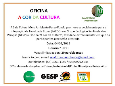 Aconteceu na Sala Futura Maio Ambiente Passo Fundo no dia 04 de setembro de 2013 a Oficina de formação do Projeto “A Cor da Cultura” do Canal Futura....