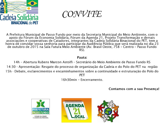 by GESP Leia Mais...Pauta:14h – Abertura Rubens Marcon Astolfi – Secretário do Meio Ambiente de Passo Fundo RS14:30 – Apresentação: Resgate do processo de mobilização e organização da Cadeia e do...